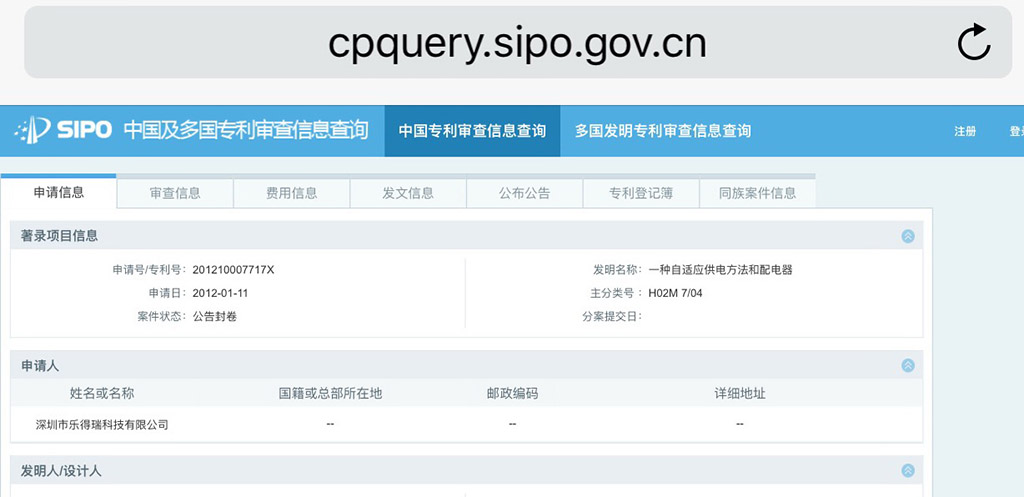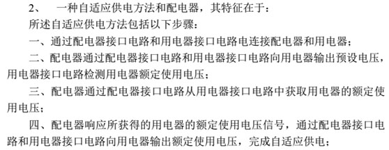 从图中我们可以看到,这篇专利获得受理的日期是2012年1月,专利题目是《一种自适应供电方法和配电器》,实际上,快速充电的一个核心思想,就是要根据电池充电过程中的伏安特性变化情况,来自适应的提供充电端的供电。因此,大多数的快速充电技术,特别是把充电管理的部分功能放在适配器端的快速充电技术都很可能被这一专利所覆盖。该专利已经被应用到LDR6021,LDR6023等芯片产品上。