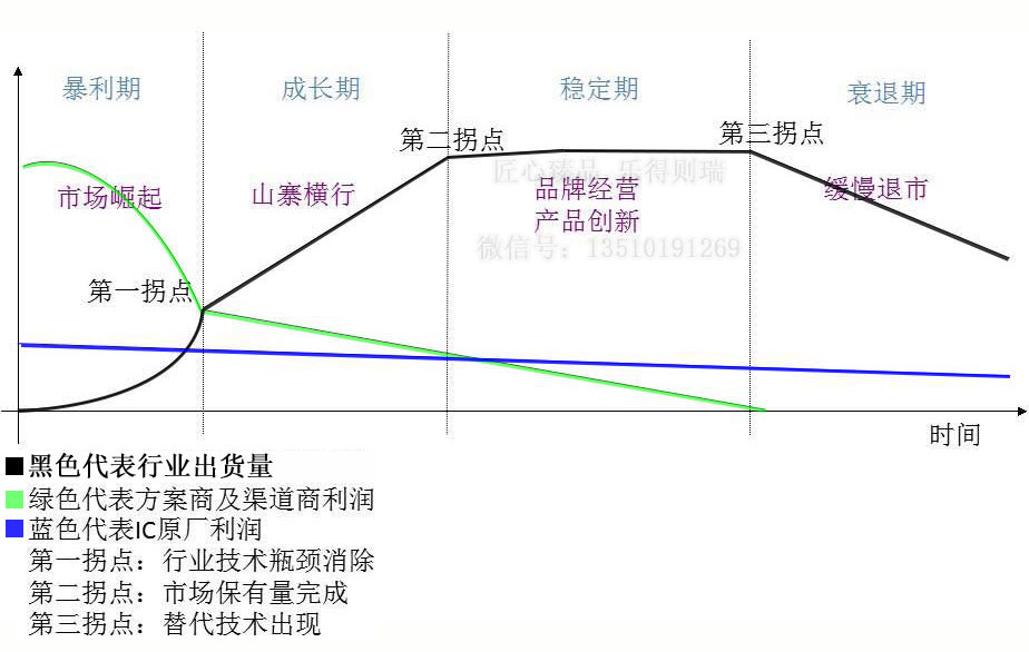 如上图所示,一个消费类电子行业的发展,我们分成四个阶段,包括暴利期、成长期、稳定期和衰退期。图中黑色代表了行业的出货量,绿色代表方案商及渠道商的利润,蓝色代表的是IC原厂的利润。这三个因素,都会随着时间的推移而演变。让我们来逐个进行分析: