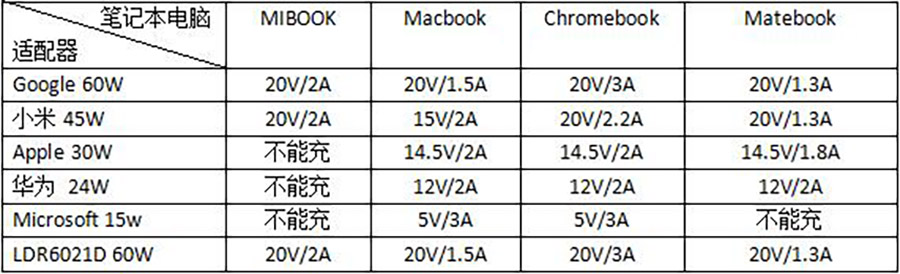 从兼容性角度考虑,Macbook和chromebook的兼容性最好,从5V到20V之间的任意电压都可以实现充电,其次是Matebook,12V到20V之间任意电压都可以充电,最后是MIBOOK,除了20V/2A以上的供电可以充以外,其他配置都不能充电。从原理上来分析,Macbook和Chromebook作为全球领先的产品,供电路径管理上有宽范围的Buck-Boost,可以很好的自适应适配器的功率,Matebook内部只有Buck,没有boost,因此不能够兼容低电压充电。MIBOOK适应性最窄的原因,可能有多个层面,一个合理的推断是,内部电池为4串,充满电压为16.8V,内部只有buck没有boost,因此只能够使用20V充电。说到底,是为了提升充电速度,并降低成本,适度牺牲了兼容性。而本次参与测试的LDR6021 60W适配器,采用了COOLMOS技术,体积只有小米原装适配器的2/3,可以看出,小体积高功率,高适应性的TYPE-C适配器,才是未来的王道。实际上,以LDR6021及LDR6022,为核心的适配器,不仅能够输出固定的5V/9V/12V/15V/20V五档固定电压,还可以通过Get_Sink_cap命令,获取用电器的动态供电需求,并构造与之完全相同的PDO,实现5V~20V/0.1A~3A的任意恒压或者恒流输出,实现基于USB PD的智能供电。