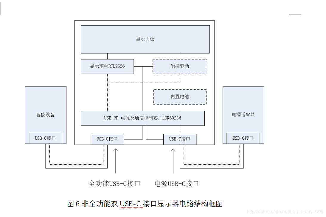 这种显示器具有双USB-C接口,但是两个口的功能不同,其中一个口是全功能的口,可以用来传输视频信号以及电源功率。另外一个口,只能够用来传输功率信号,不可用于传输视频信号。实际上相当于把显示器常用的圆形直流供电口修改为USB-C供电口。此类显示器的线路结构简单,特别适合于低成本的便携式显示器。